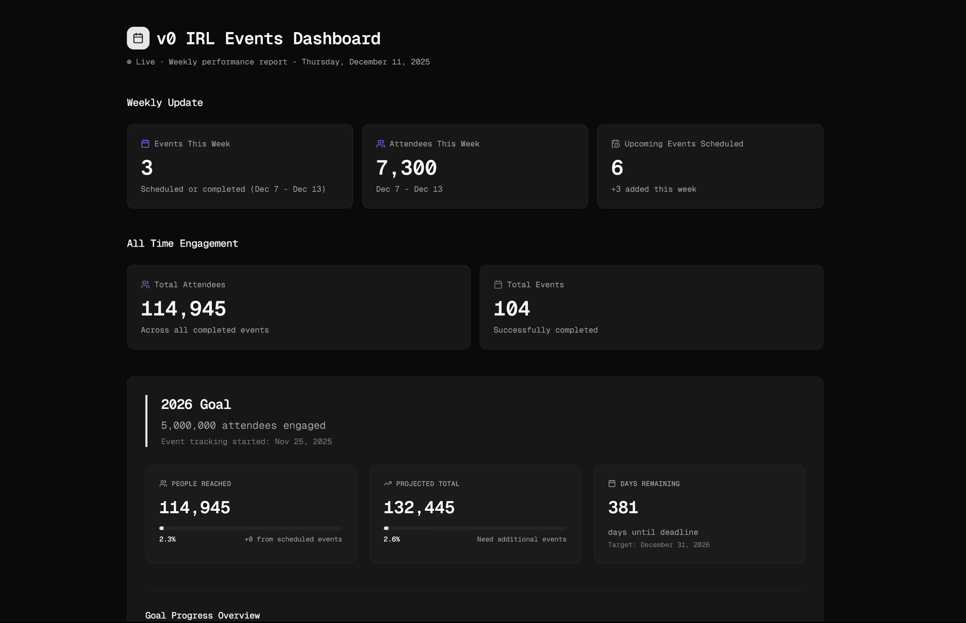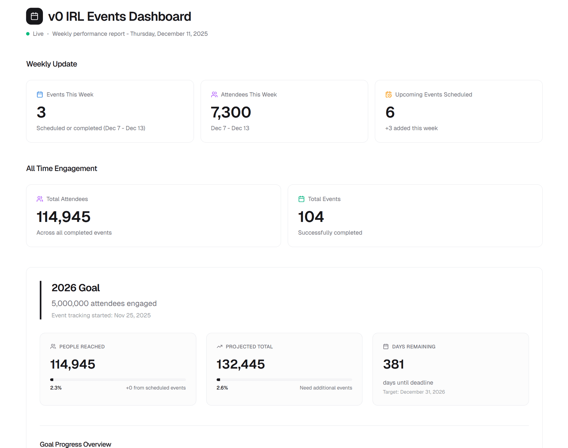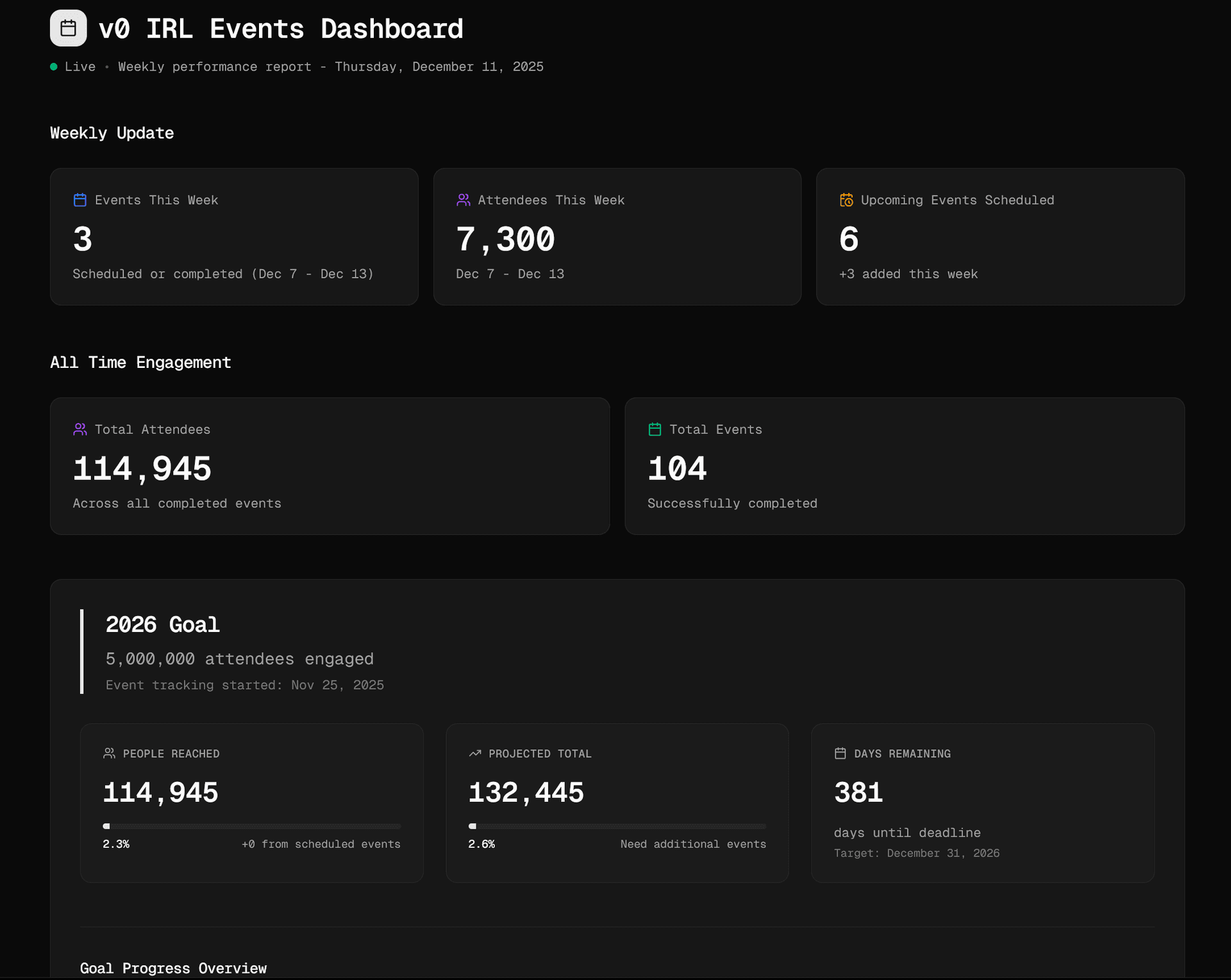 And with write access, v0 didn’t just generate the dashboard. It also wrote the weekly summary and key metrics directly back into our Notion events page.