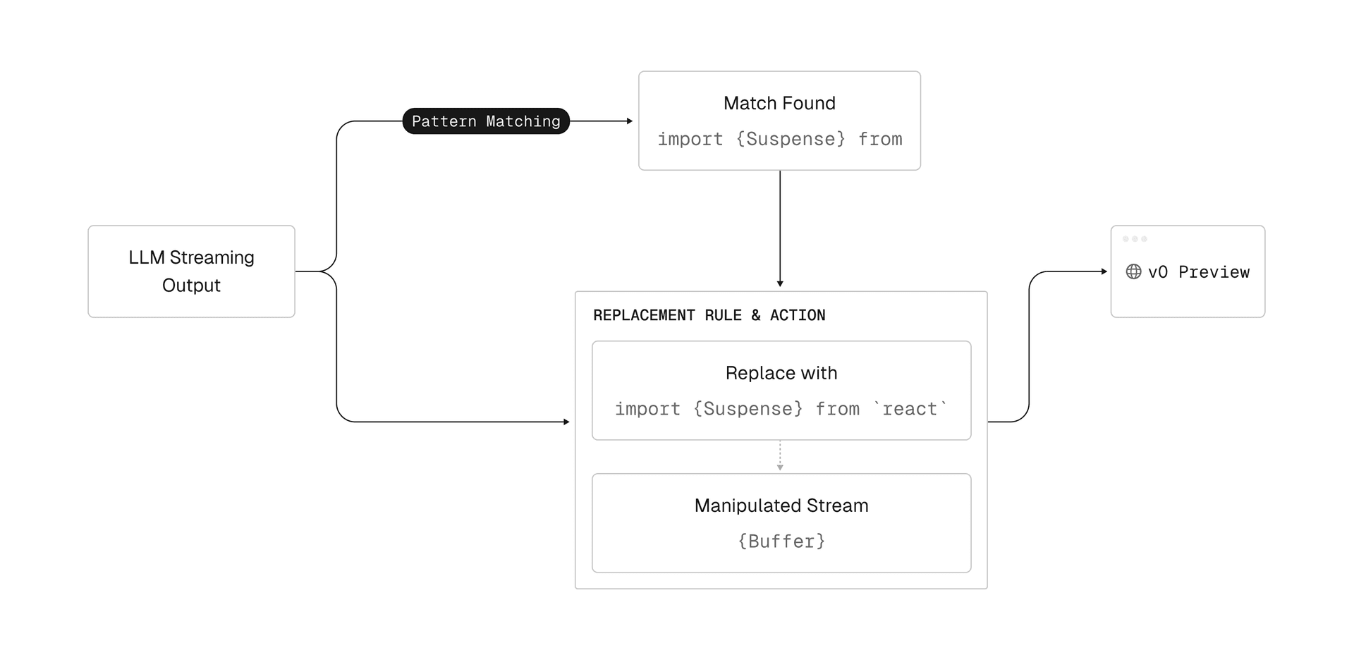 LLM Suspense is a framework that manipulates text as it streams to the user. This includes actions like find-and-replace for cleaning up incorrect imports, but can become much more sophisticated.