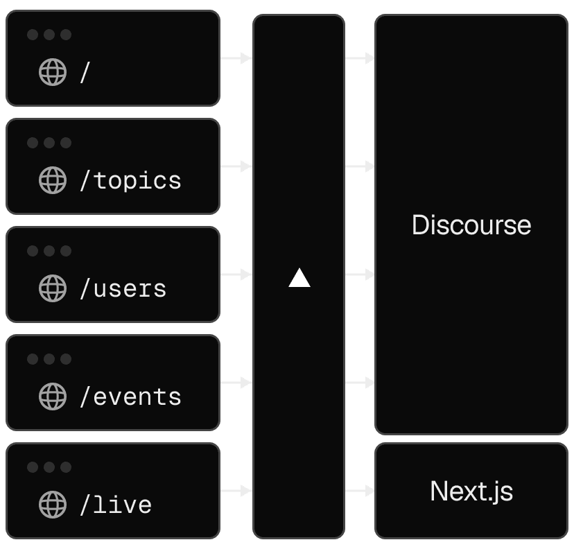 Some parts of the community platform, like Vercel Community live sessions, run directly on Vercel with Next.js. We use Vercel Microfrontends to mount a Next.js app on the same domain as the Discourse app, for three reasons: