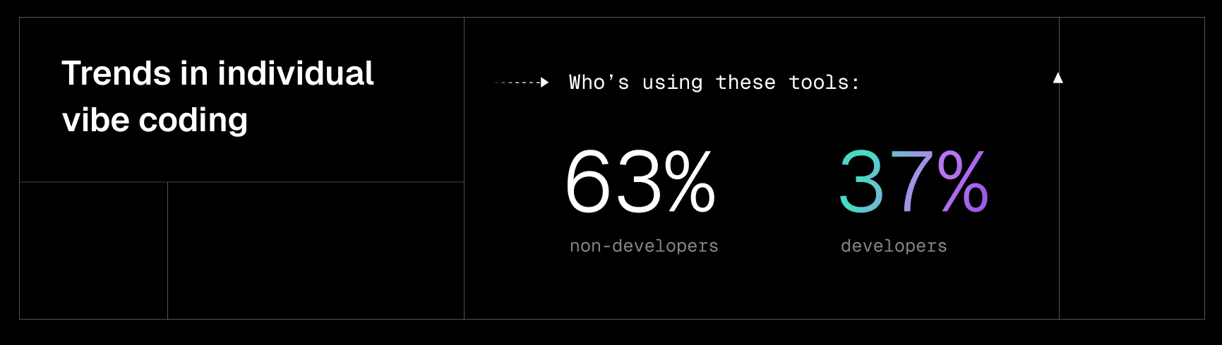 In fact, most vibe coders aren’t developers at all. About 63% of users exploring vibe tools are non-developers, using tools like v0 or Cursor to streamline tasks and create custom solutions to their problems.
